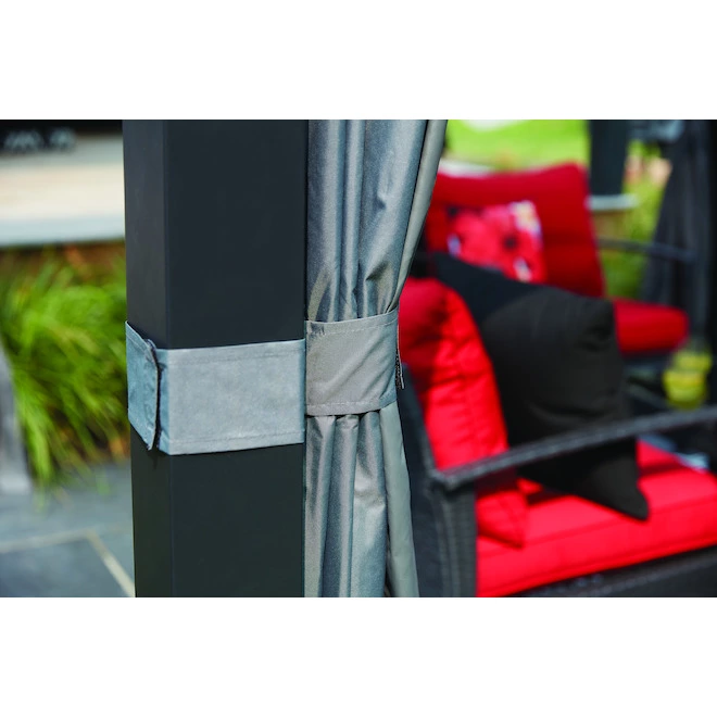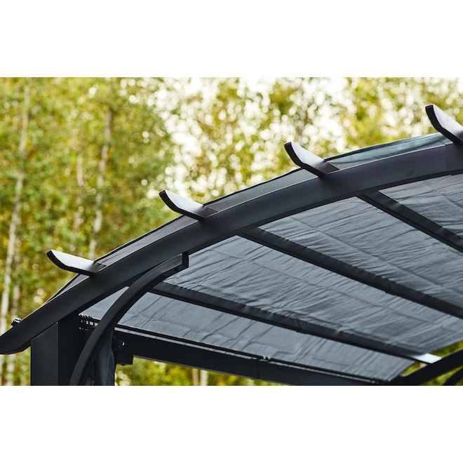 Add a touch of originality to your yard with this beautiful pergola, which features a heavy-duty steel frame with a powder-coated finish that’s designed to stand up against the elements, ensuring you’ll be able to use it for years to come. The grey arched sling canopy boasts a unique design that creates the illusion of more interior space, while individual side curtains are easy to open or close, depending on your preferred level of shade and privacy. The top canopy is easy to remove; simply unscrew the knob-ended bolt at each corner. This pergola is backed by a 1-year limited warranty to give you peace of mind.