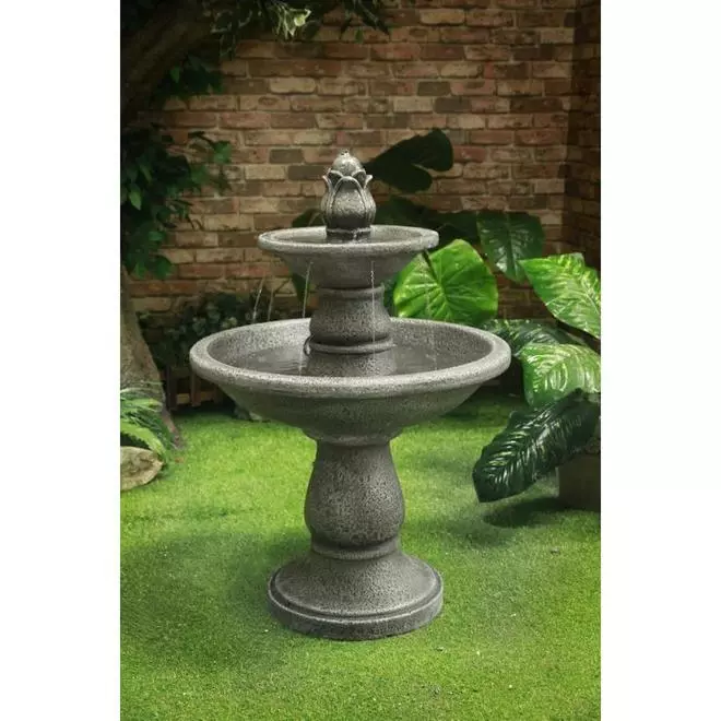 Enjoy the soothing sounds of the water with this lovely pedestal fountain by Infinity. Crafted and painted by hand, the 2-tier circular fountain will be a beautiful addition to your outdoor space.