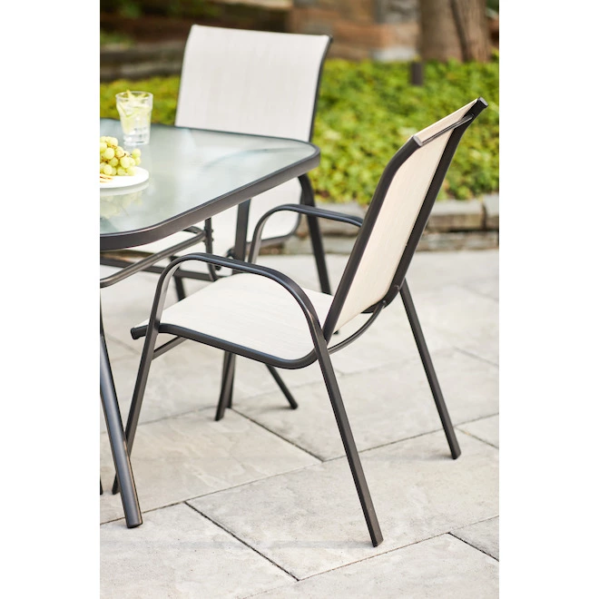 This stackable chair can be used alone or combined with your existing patio furniture. Manufactured in durable powder coated steel and designed for long-term outdoor use. Easy to clean sling fabric.