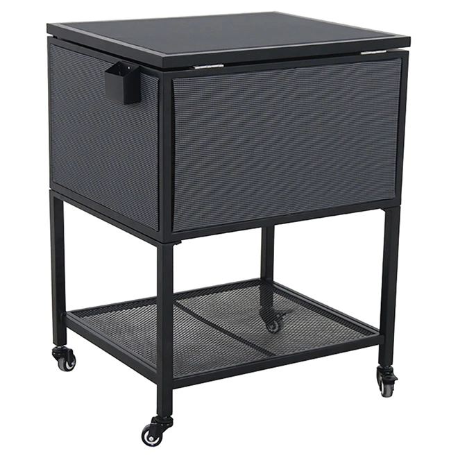 Keep your beverages nice and cold with this attractive cooler « New Pagosa ». It is equipped with a bottle-opener, a bottom shelf for storage and wheels that allow you to move it around as needed. The frame is fabricated of black steel and strong brown sling of 520 GSM. This product is backed by a 1-year warranty.