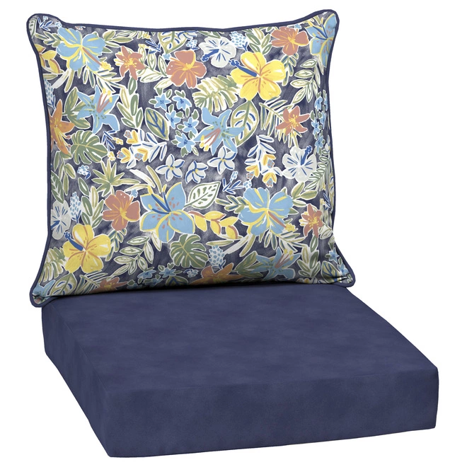Designed to fit most deep-seat patio chairs, these Style Selections cushions are made of fade and weather-resistant polyester fabric and are filled with everLUXE®, a superior poly fill that helps the cushions retain their shape. Reversible floral backrest cushion with a blue seat cushion.
