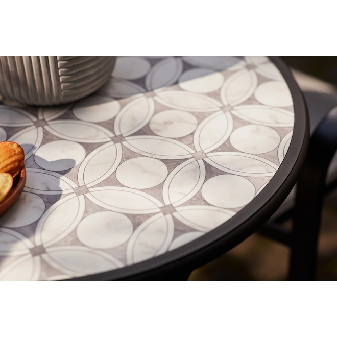 - Ceramic tile tabletop with geometric pattern in white and gray