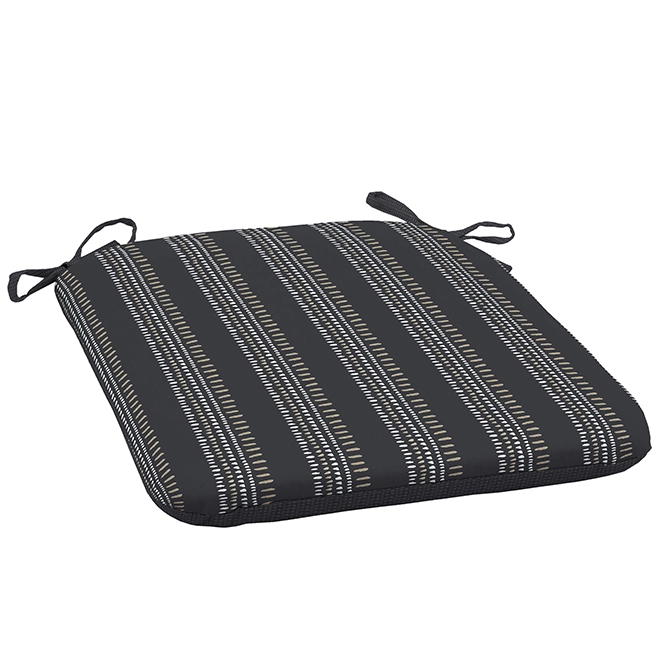 This outdoor chair seat cushion from Style Selections fits most wrought iron and Adirondack style chairs. It has a UV-resistant black polyester fabric featuring a stripe pattern and is filled with everLuxe, a superior poly fill that helps the cushion retain its shape over time. Clean by using a sponge with a mixture of 2 capfuls of dish soap in 1 gallon of water, rinse well and air dry, and never use bleach or harsh cleaners. 1-year limited warranty.