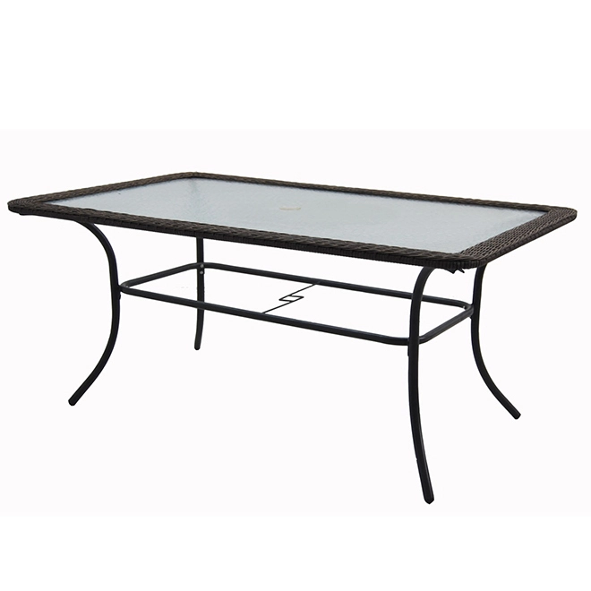 A stylish choice, this Style Selections Spruce Hills dining table will add ample seating space to your outdoor living area. This beautiful patio table features a heavy-duty steel frame covered in all-weather wicker for long-lasting durability. Plus, the rectangular tabletop is made of tempered glass for style and additional safety. It even has a hole to fit an umbrella (sold separately) for your convenience. This spacious outdoor table is perfect for seating up to 6 people. It even comes with a 1-year limited warranty for peace of mind. For the perfect outdoor decor, pair it with other patio furniture from the Spruce Hills collection.